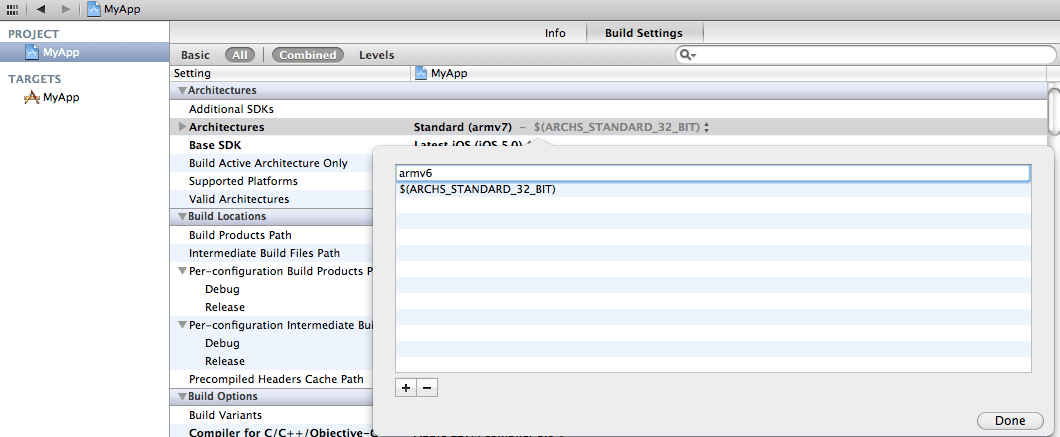 - Add the “armv6” architecture into the “Build Settings”