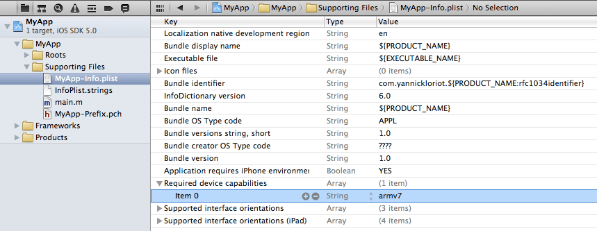 - in the “MyApp-Info.plist”: limit the capabilities of the device to the ARMv7 architecture only